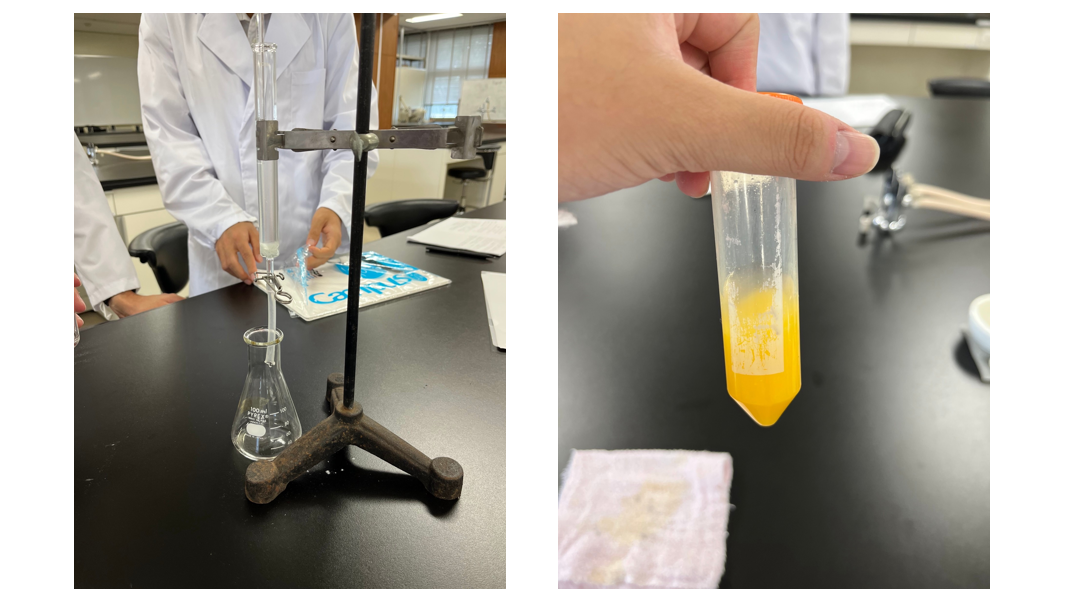 上の写真は、脂質を抽質して、含まれている脂質の種類を推定する実験の様子です。